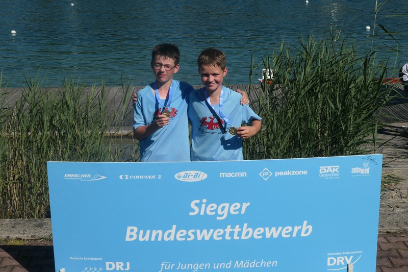 Eröffnet wurde diese Regatta aus KWer Sicht durch Isaak und Finley. Die beiden lieferten sich im vierten Abteilungsrennen ein packendes Duell mit ihren Teamkollegen aus Plaue. Am Ende ruderten unsere beiden zu einer stolzen Goldmedaille, freuten sich aber ebenso über die Silbermedaille für Plaue, die weitere Punkte für das Team Brandenburg brachte.