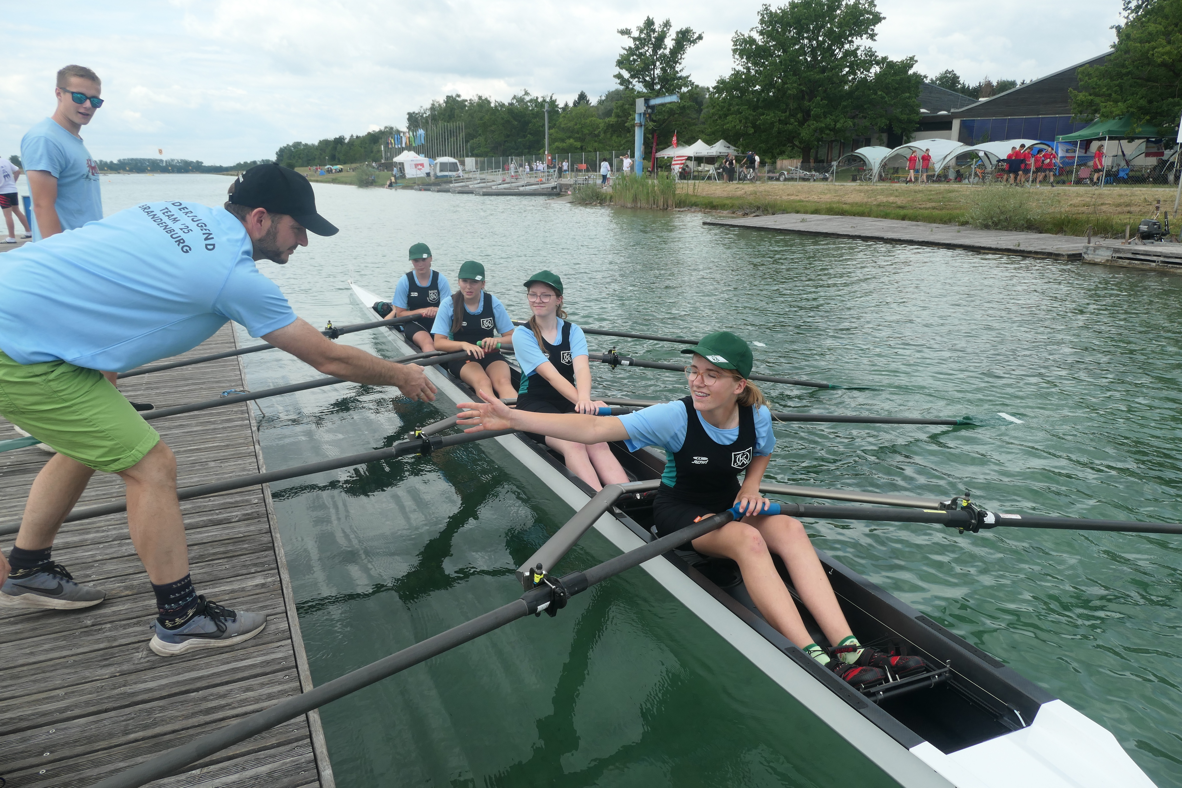 Raus aus dem Schatten, rein in die Sonne, sahen wir zunächst unsere Mädels im Mädchenvierer 12/13 Jahre. Und Soraya, Ella, Melissa, Lotti und Marlene zeigten, dass wir in den letzten Wochen hervorragend gearbeitet haben. Die wollten beweisen, dass sie zurecht zu den sechs schnellsten Booten in Deutschland gehören - und das taten sie. Mit der schnellsten Zeit der Saison bei einer absoluten Hitzschlacht, bestätigten sie hinter den Sportschulen aus Magdeburg, Halle, Potsdam und Bernburg ihre sechstschnellste Zeit von der Langstrecke und schlossen den Bundeswettbewerb 2025 mit einem hervorragenden sechsten Platz vom gesamten Feld ab.